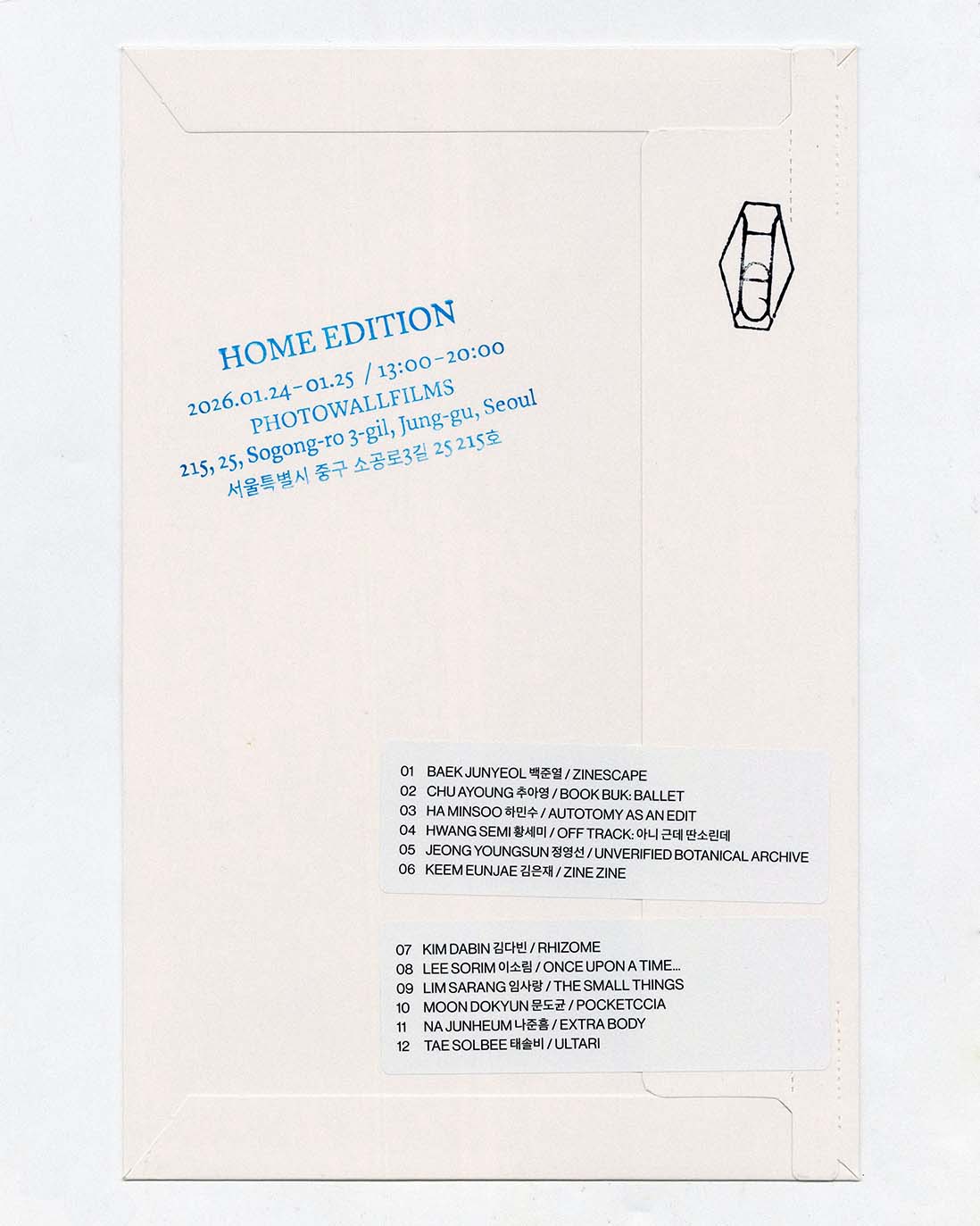김다빈, 김은재, 나준흠, 문도균, 이소림, 임사랑, 백준열, 추아영, 태솔비, 하민수, 황세미 동문이 참여한 페어 《HOME EDITION》가 중구 포토월필름에서 열렸습니다. 열두 명의 창작자가 각자의 관점을 담아 펴낸 다양한 진(Zine)을 한자리에 모은 해당 페어에서는 홈메이드 출판물을 모은 작은 진페어를 진행했습니다. 현장에서는 진을 자유롭게 관람하고 구매할 수 있는 공간이 마련되었습니다.