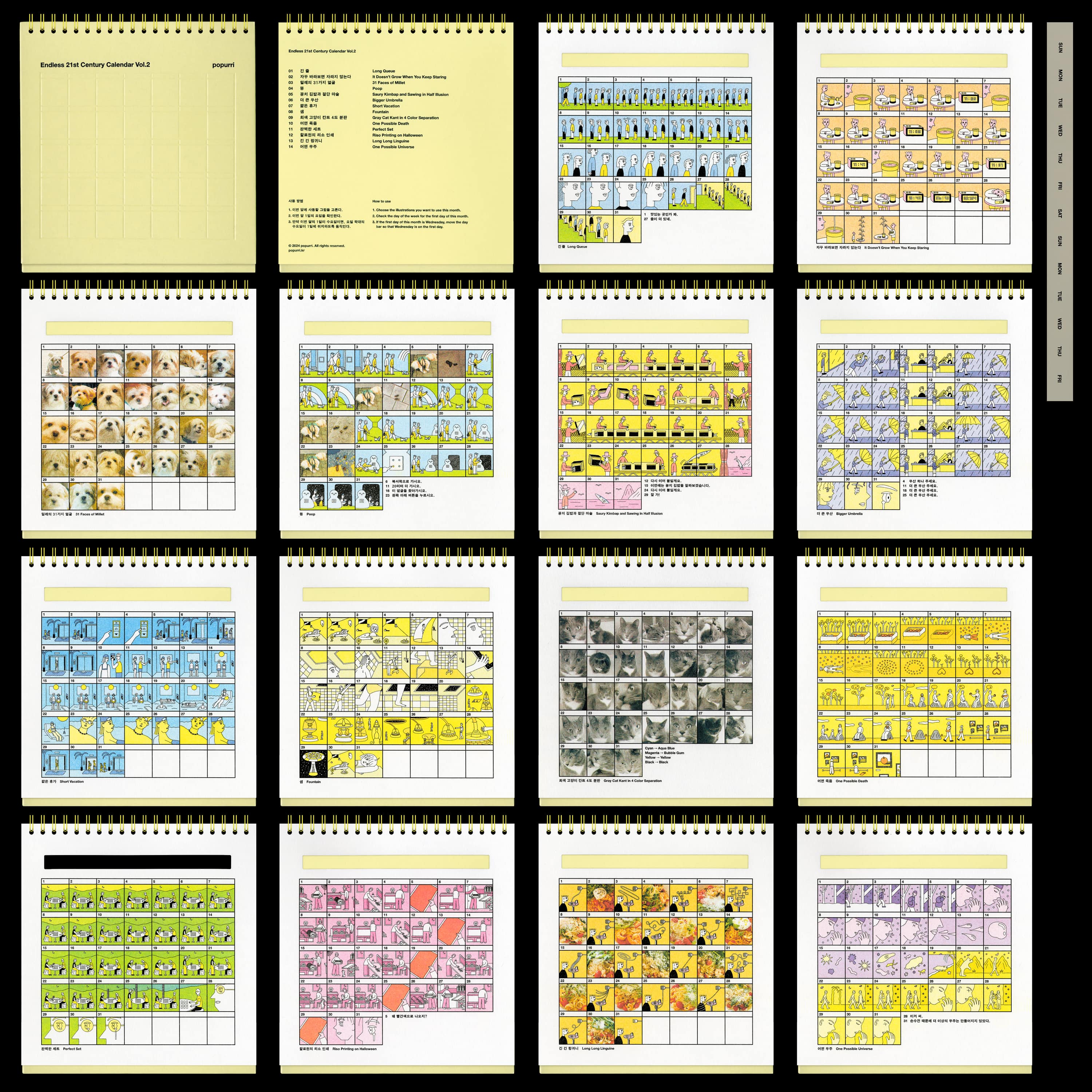 가장 최근에 만든 만년 달력 두 번째 버전, 〈Endless 21st Century Calendar Vol. 2〉 에서 소개하고 싶은 이야기를 꼽자면 ‘똥’, ‘꽁치 김밥과 절단 마술’, ‘어떤 죽음’이에요. '똥'은 저희 집 강아지 밀레가 산책하면서 싼 똥 사진으로 만든 이야기인데요. 똥 모양에서 재밌는 형태를 찾는 작업을 해보고 싶어서 몇 년간 똥 사진을 모았거든요. 맛보기처럼 캘린더에서 먼저 이 사진을 쓰게 되었어요. 산책하던 밀레가 여러가지 모양으로 똥을 싸는데, 거기서 '북서쪽으로 가시오.', '20미터 더 가시오.'와 같은 메시지를 읽어내고 그대로 따라가다가 비밀 공간을 찾는 내용이에요.